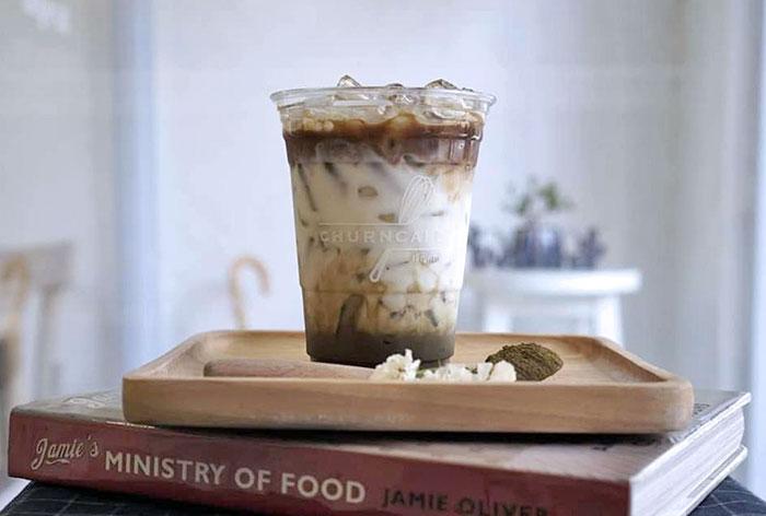 Recommended menu: Churn signature coffee - 85Baht, Hojicha coffee latte - 95Baht, Homemade soft chocolate - 80Baht, Cheesy ham & egg sandwich - 95Baht, Spaghetti spicy pork ball - 125Baht