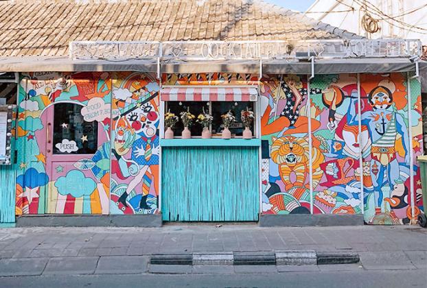 You can’t miss this show-stopping spot in Seminyak. Look out for a brightly coloured beach shack style building, painted in a stunning mural of turquoise and pink, complete with a neon pink bench outside.