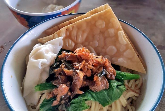 Javanese noodles have a soft texture due to their unique cooking process. A bowl of chicken noodles consists of boiled mustard greens, a sprinkling of garlic onion leaves and fried dumplings. The magic of the seasoning lies in the chicken oil mixture, made by vegetable oil, ginger, pepper, coriander, and garlic.