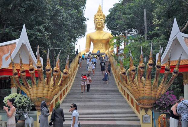 This 18m high statue of the benevolent Buddha dominates the landscape, towering over Pattaya. It is located on the hill that divides Pattaya from Jomtien Beaches. The panoramic view of the hustle below is a contrast to the calm serenity of the temple complex. The temple serves as a place of worship for locals, who visit it regularly. The use of gold in the statue of the Buddha, as well as many of the smaller statues and carvings, creates an intriguing effect. Be prepared for plenty of stairs. However, those who have visited find them easy to manage and well worth the effort when they experience the unique ambiance at the top.